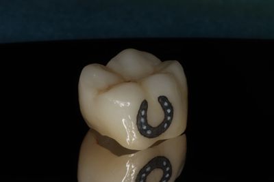 A miniature crown tattooed onto an actual dental crown. Dentists tell us patients laugh every time they see it in the mirror.